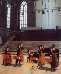 ![]() Gründungsbesetzung 1996 (v. lks. nach re.) Helena Mezej (Kroatien), Tae-Bun Park (Süd-Korea), Zsuzsanna Juhasz (Ungarn), Sandra Cvitkavoc (Serbien) |